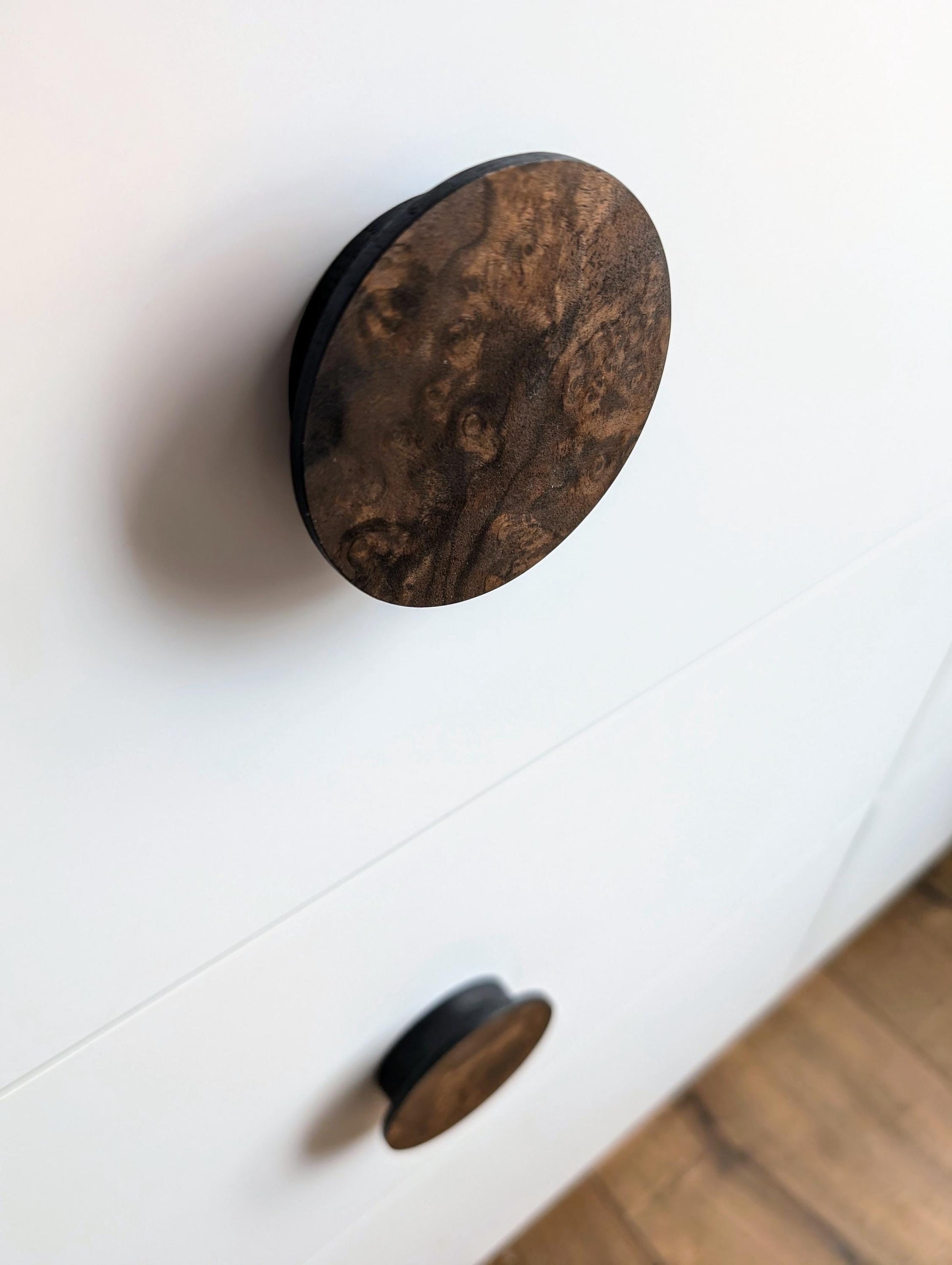 Enhance your furniture with the natural elegance of our American Walnut Veneer Knobs. Each piece is crafted by hand using fine walnut root veneer over solid oak, showcasing a beautiful, organic wood pattern. Perfect for modern, Scandinavian, or rustic interiors, these knobs can also serve as stylish wall hooks or decorative accents.